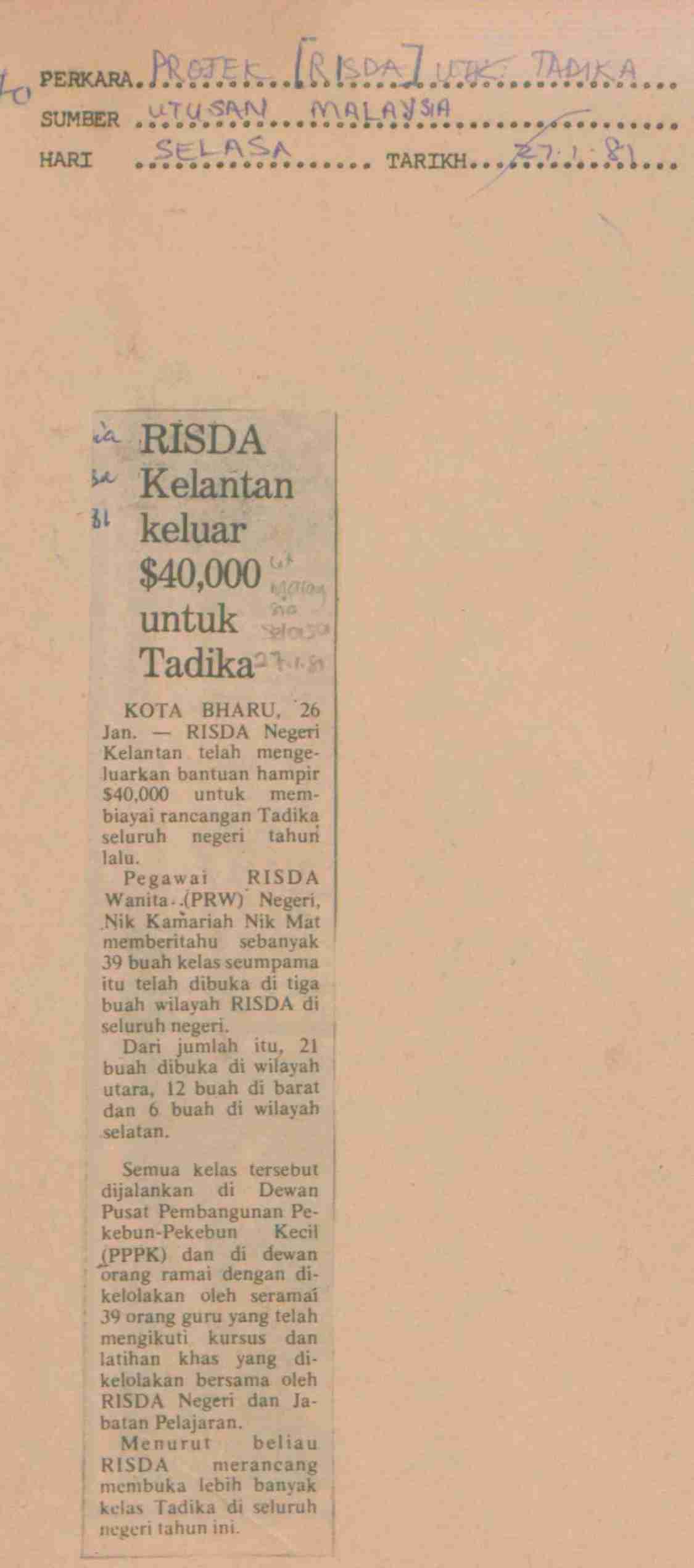 Utusan Malaysia (1981) RISDA Kelantan keluar $40,000 untuk Tadika. Utusan Malaysia. |