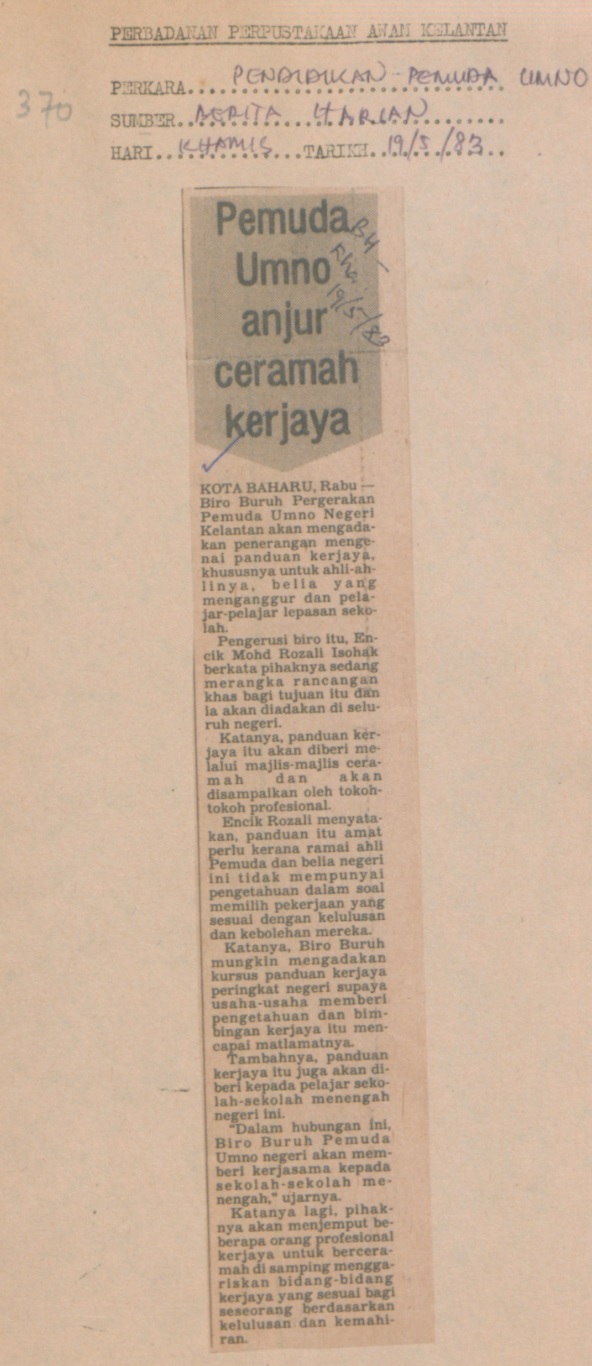 Berita Harian (1983) Pemuda umno anjur ceramah kerjaya. UNSPECIFIED. |