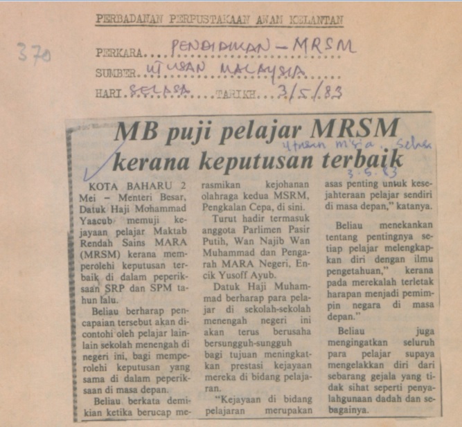 Utusan Malaysia (1983) MB puji pelajar MRSM kerana keputusan terbaik. UNSPECIFIED. |