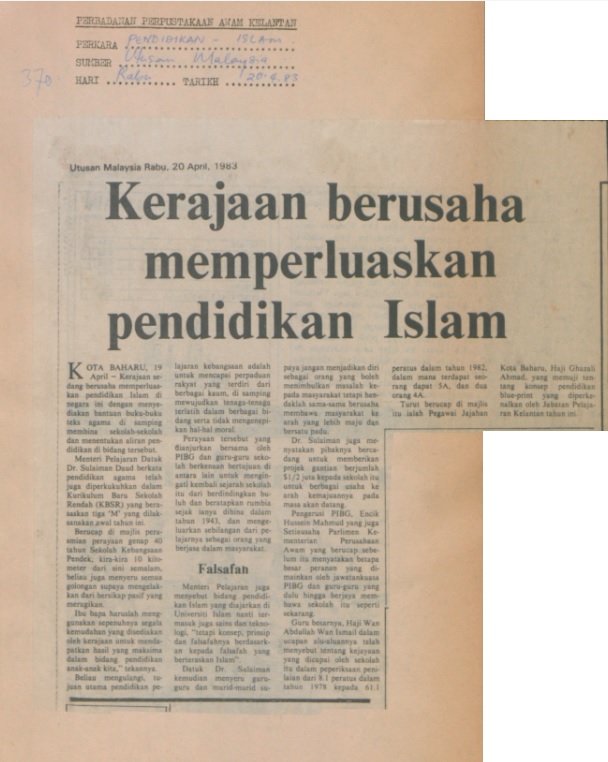 Utusan Malaysia (1983) Kerajaan berusaha memperluaskan pendidikan islam. UNSPECIFIED. |