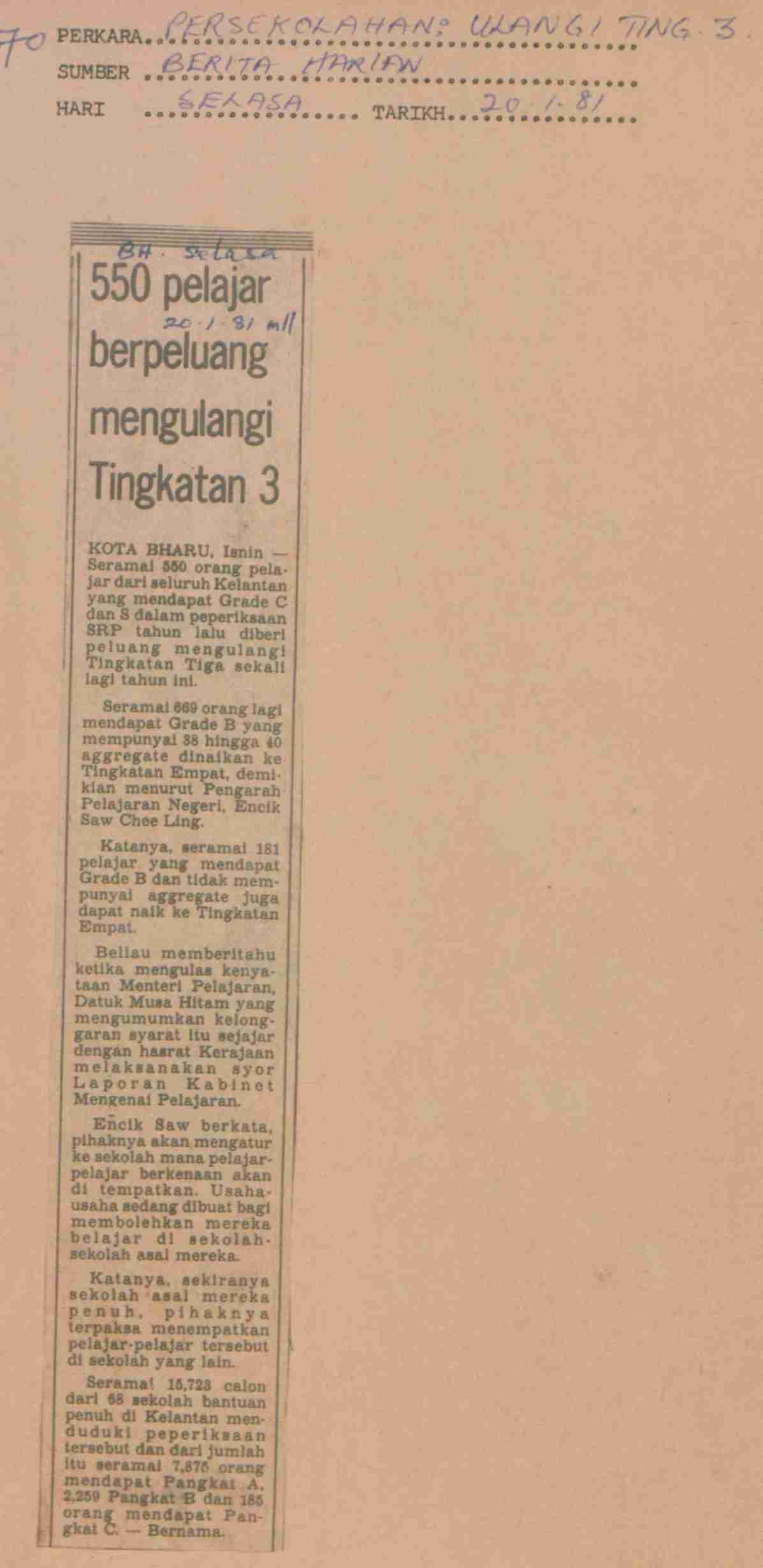 Berita Harian (1981) 550 pelajar berpeluang mengulangi Tingkatan 3. Berita Harian. |