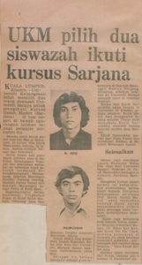Berita Harian (1975) UKM pilih dua siswazah ikuti kursus sarjana. Berita Harian. |