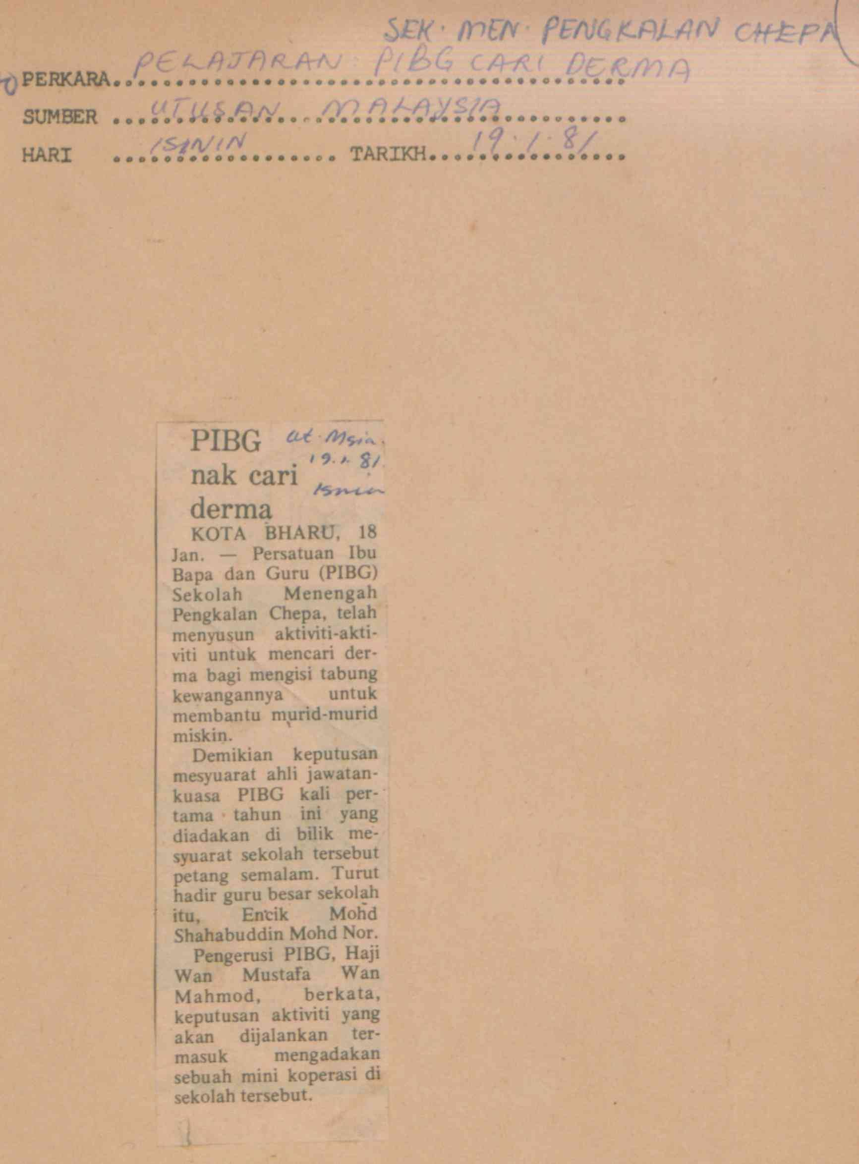Utusan Malaysia (1981) PIBG nak cari derma. Utusan Malaysia. |