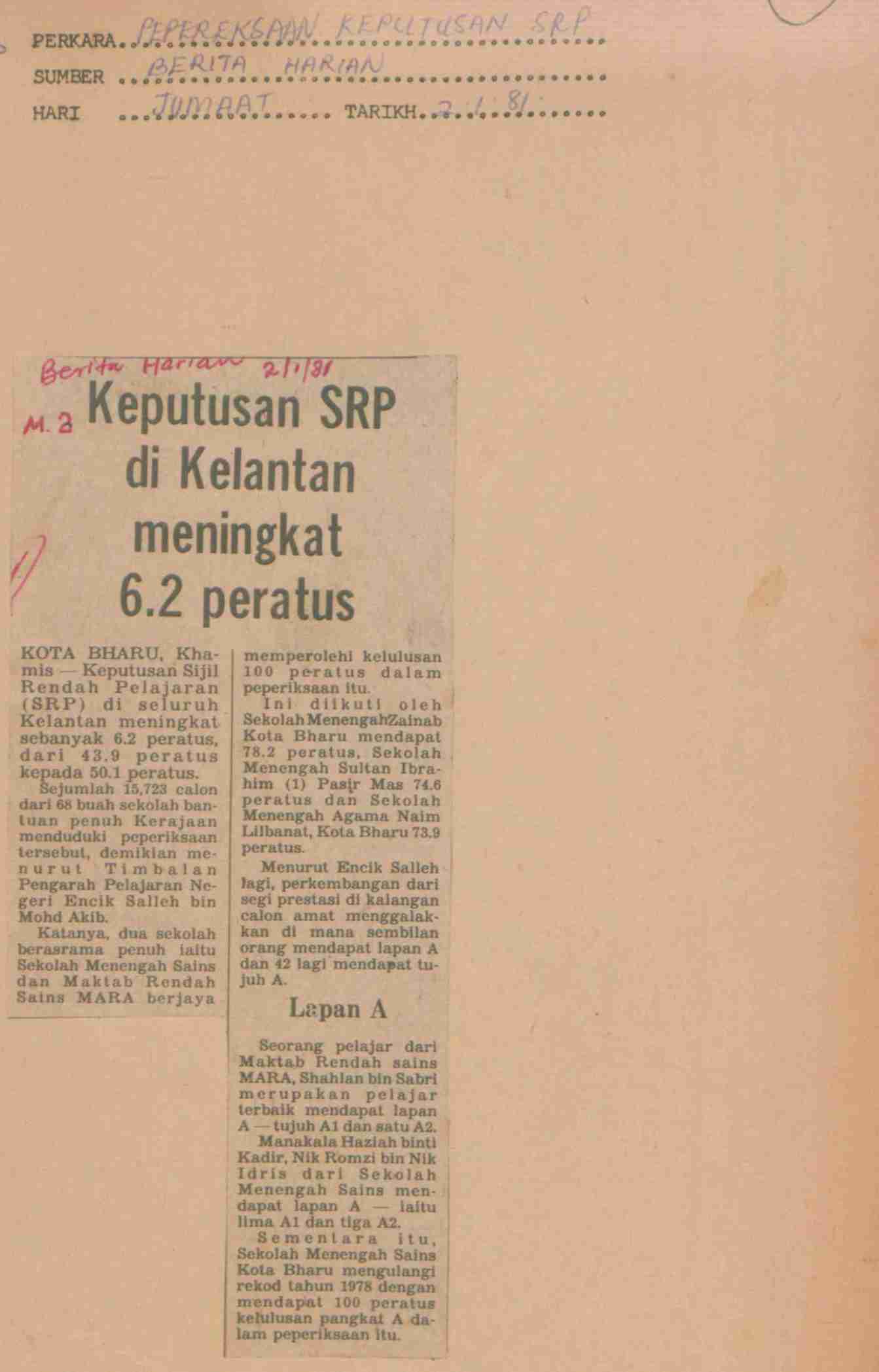 Berita Harian (1981) Keputusan SRP di Kelantan meningkat 6.2 peratus. Berita Harian. |