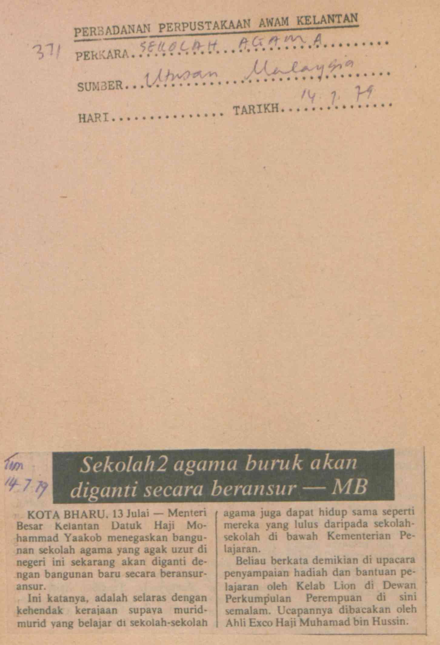 Utusan Malaysia (1979) Sekolah2 agama buruk akan diganti secara beransur-MB. Utusan Malaysia. |