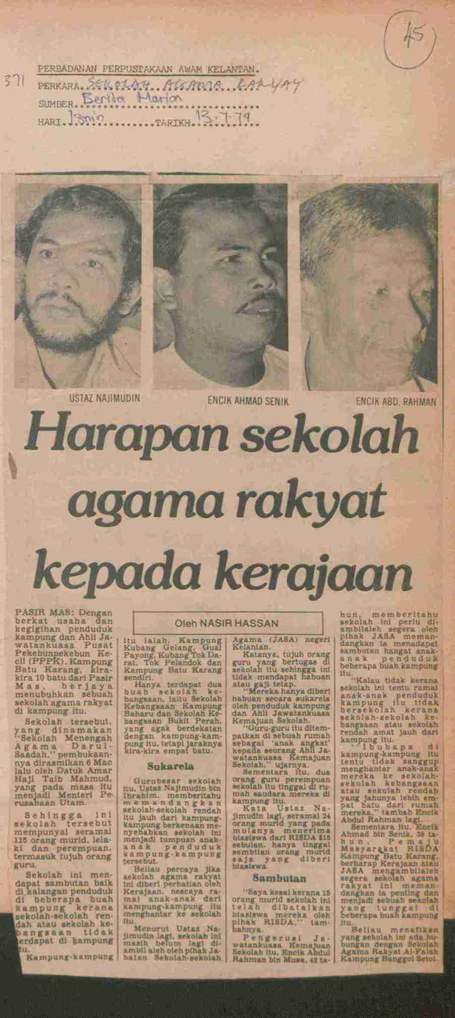 Berita Harian (1979) Harapan sekolah agama rakyat kepada kerajaan. Berita Harian. |