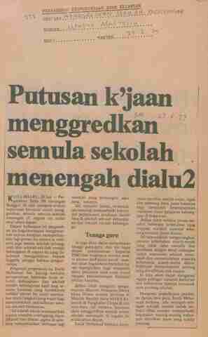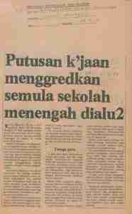 Utusan Malaysia (1979) Putusan k'jaan menggredkan semula sekolah menengah dialu2. Utusan Malaysia. |