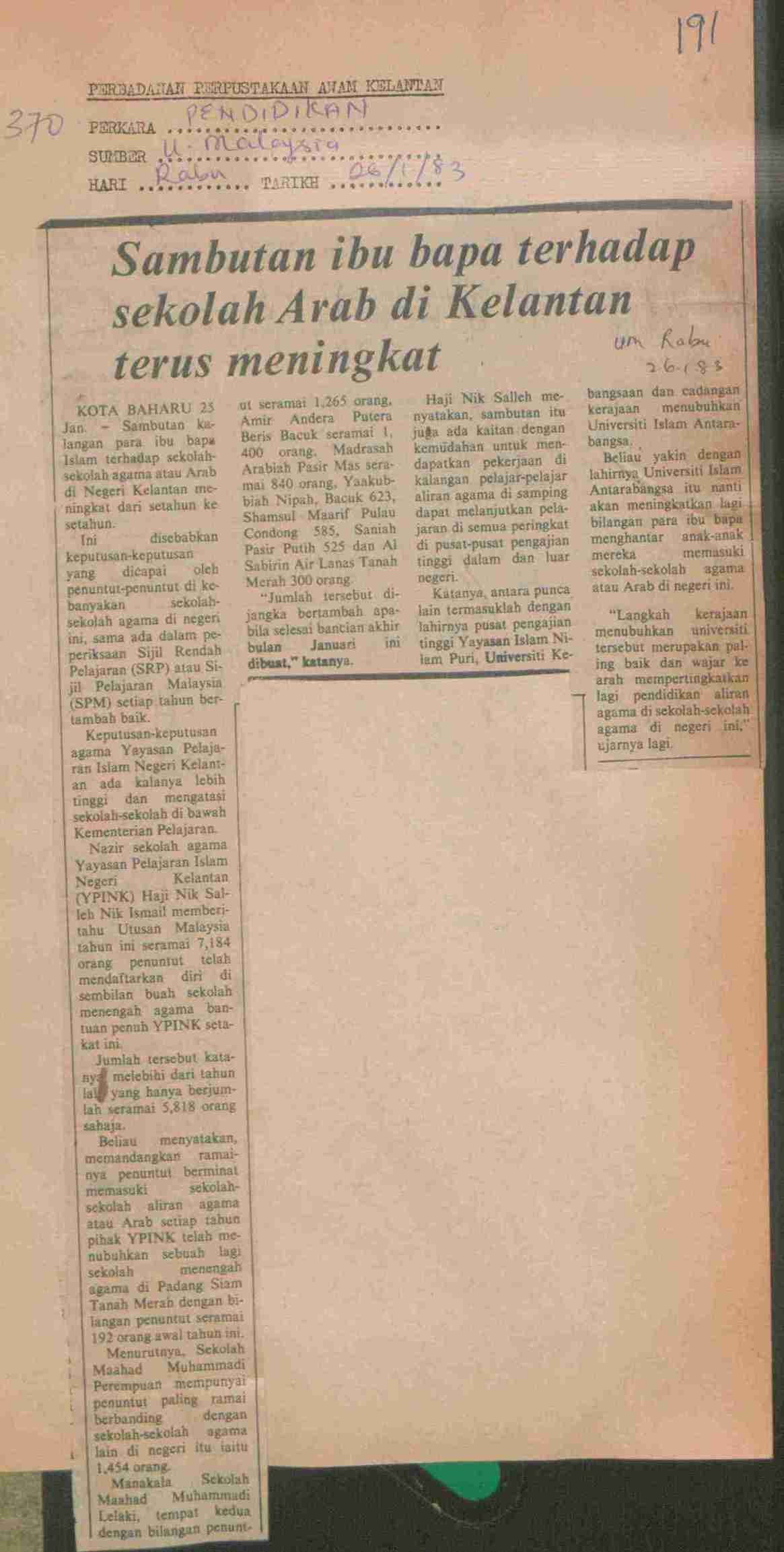 Utusan Malaysia (1983) Sambutan ibu bapa terhadap sekolah Arab di Kelantan terus meningkat. Utusan Malaysia. |