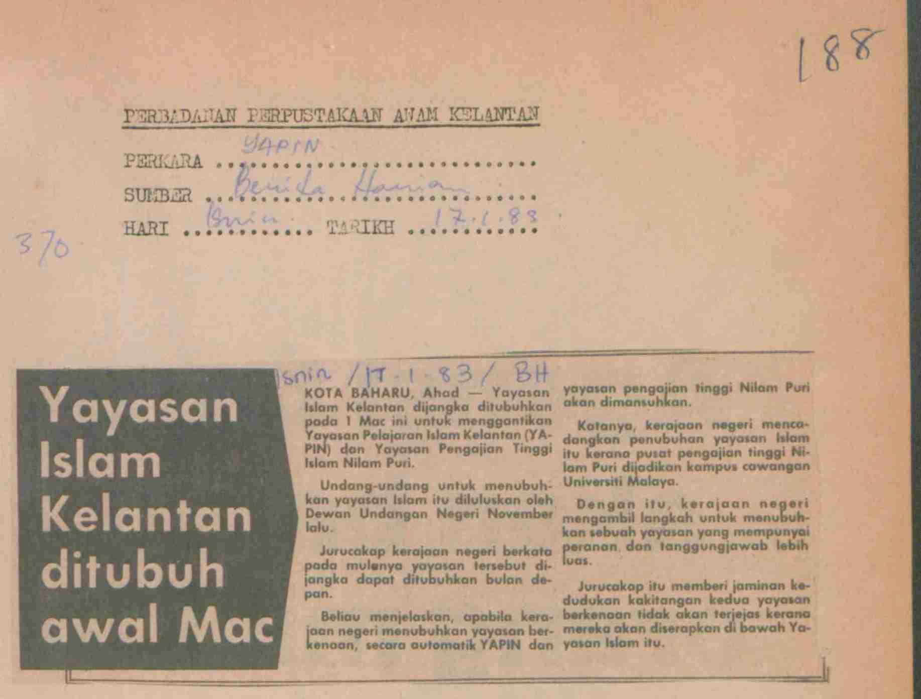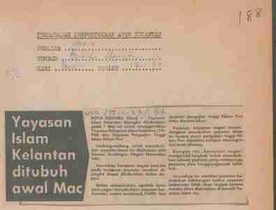 Berita Harian (1983) Yayasan Islam Kelantan ditubuh awal Mac. Berita Harian. |