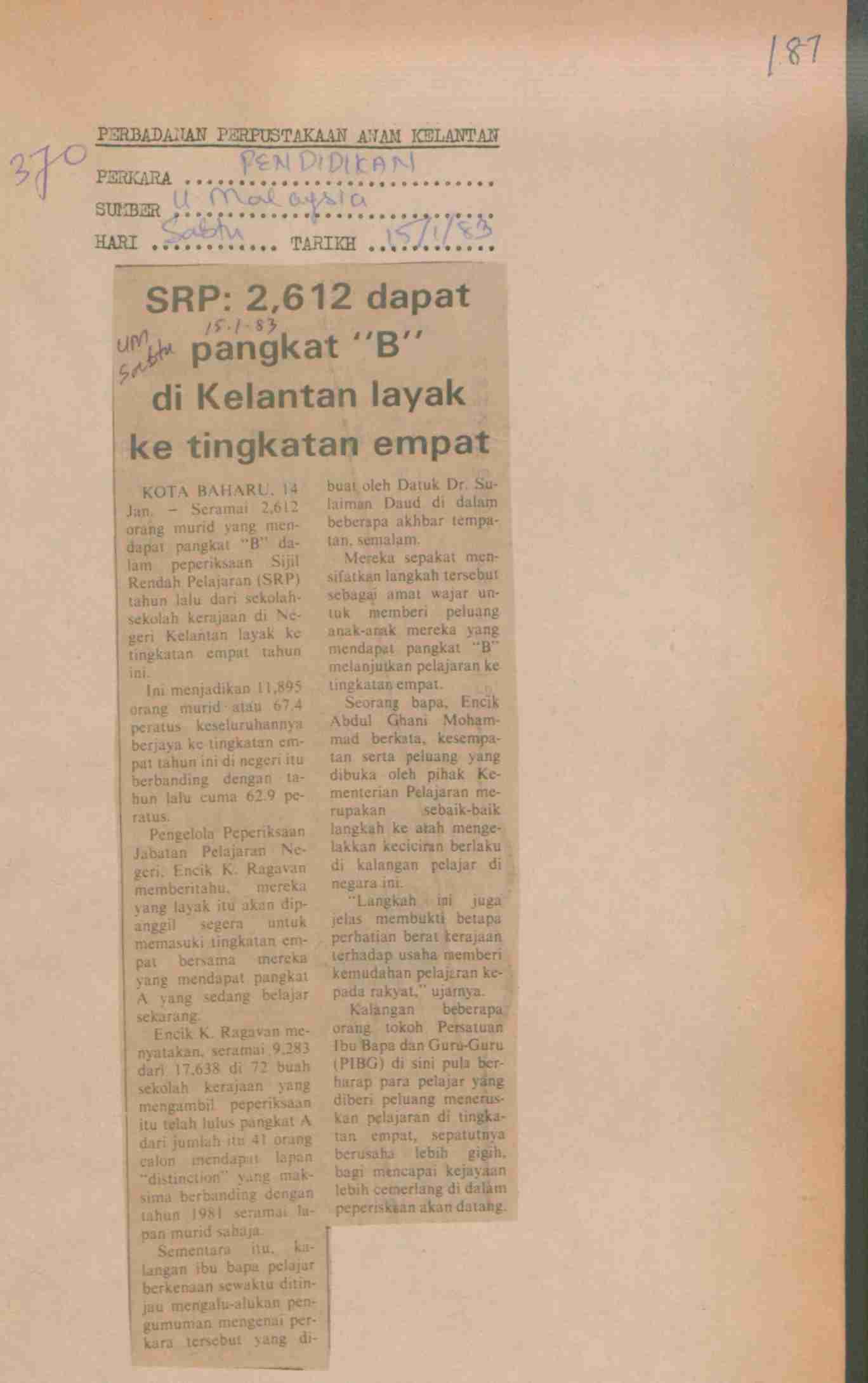Utusan Malaysia (1983) SRP: 2,612 dapat pangkat B di Kelantan layak ke tingkatan empat. Utusan Malaysia. |