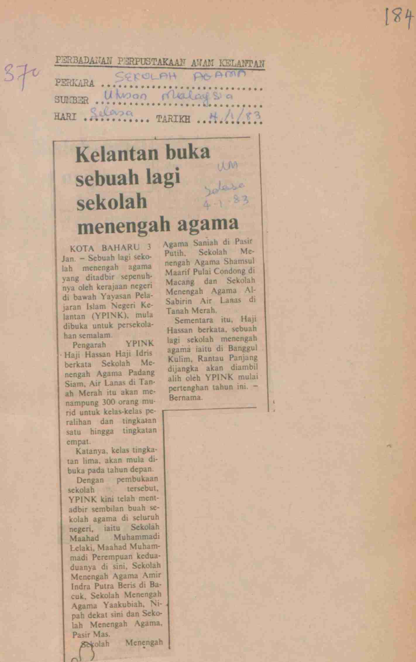 Utusan Malaysia (1983) Kelantan buka sebuah lagi sekolah menengah agama. Utusan Melayu. |