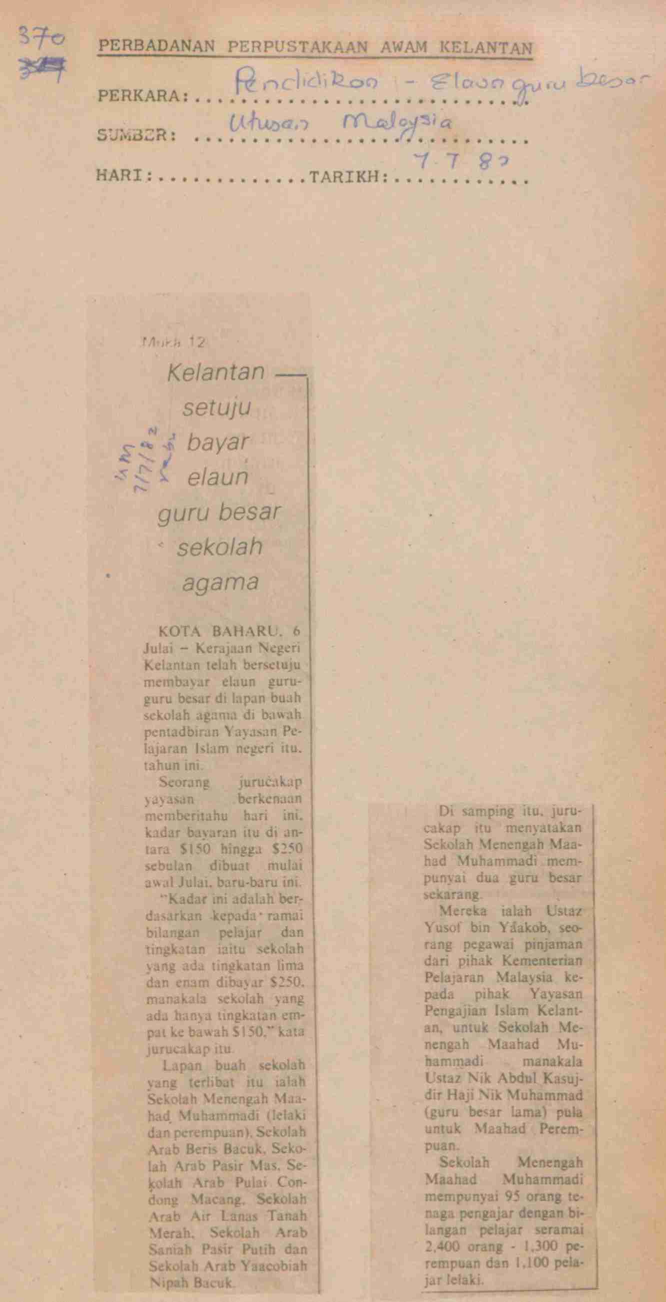 Utusan Malaysia (1982) Kelantan setuju bayar elaun guru besar agama. Utusan Malaysia. |