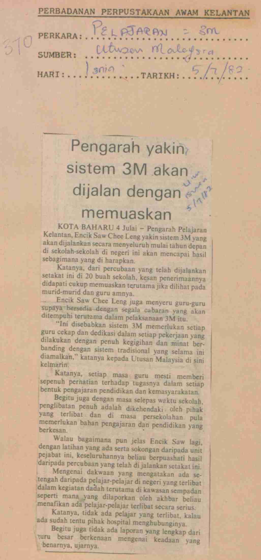 Utusan Malaysia (1982) Pengarah yakin sistem 3M akan dijalan dengan memuaskan. Utusan Malaysia. |