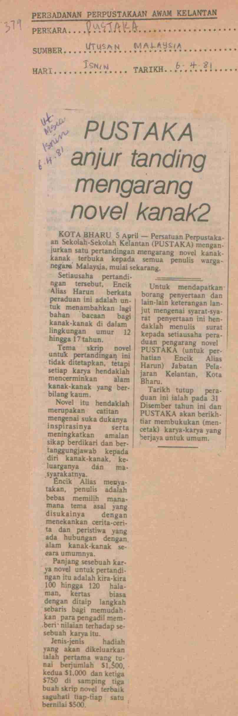 Utusan Malaysia (1982) PUSTAKA anjur tanding mengarang novel kanak2. Utusan Malaysia. |