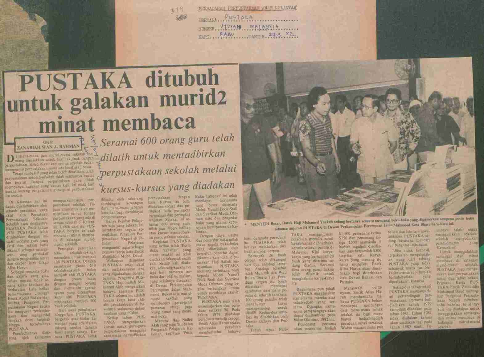 Utusan Malaysia (1982) PUSTAKA ditubuh untuk galakkan murid2 minat membaca. Utusan Malaysia. |