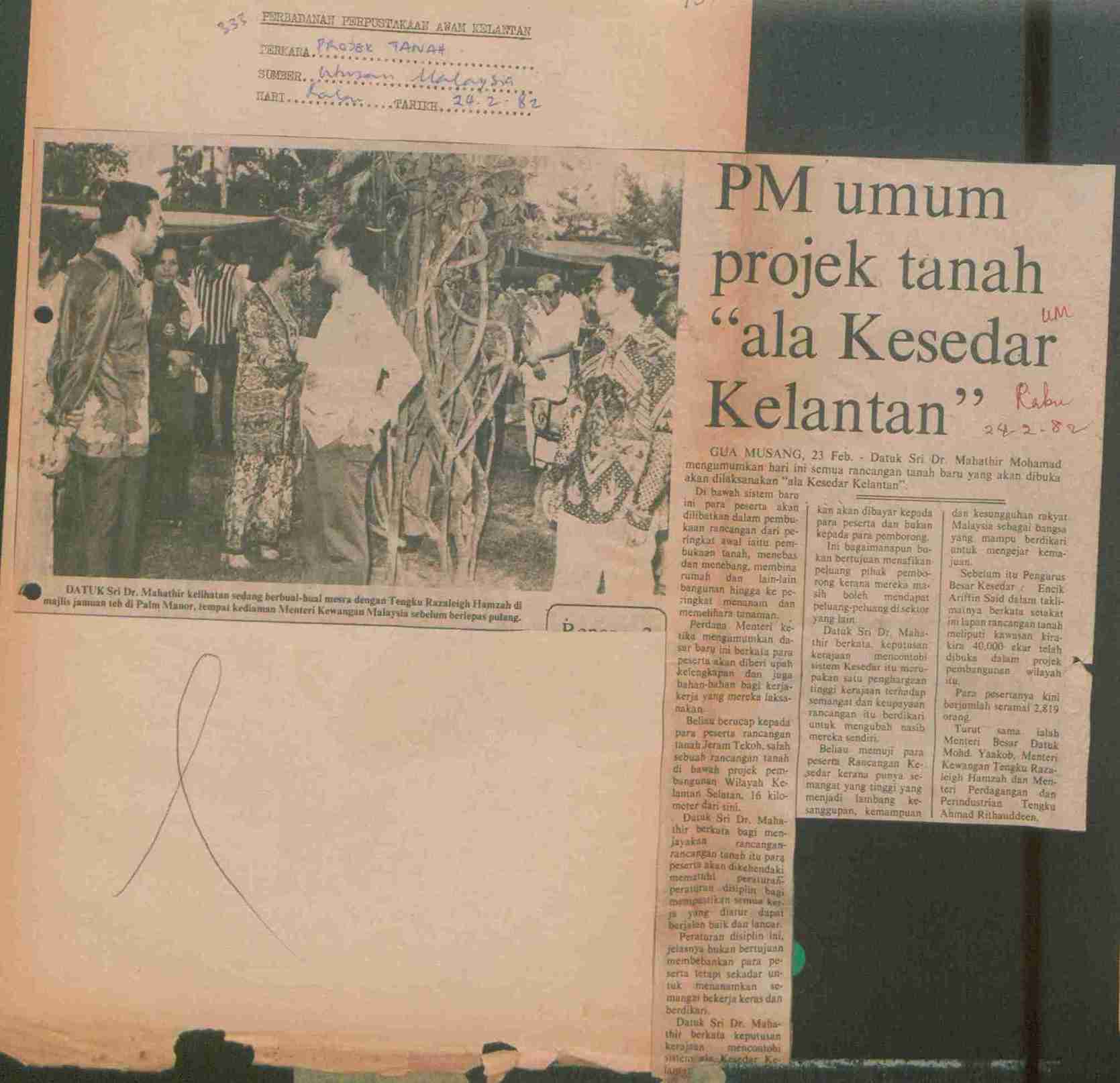 Utusan Malaysia (1982) PM umum projek tanah "ala Kesedar" Kelantan. Utusan Malaysia. |