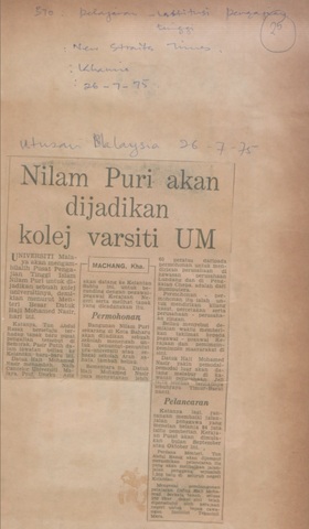 Utusan Malaysia (1975) Nilam Puri akan dijadikan kolej varsiti UM. Utusan Malaysia. |