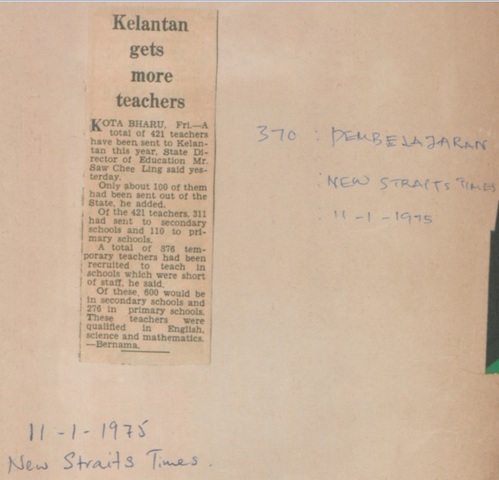 New Straits Times (1975) Kelantan gets more teachers. New Straits Times. |