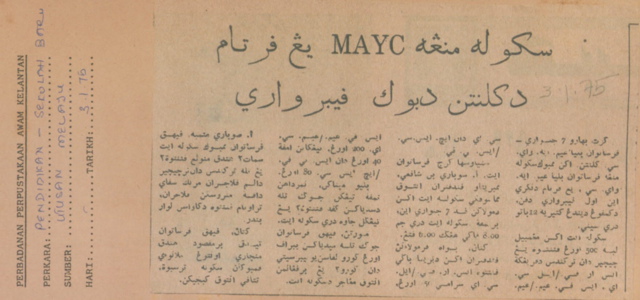 Utusan Malaysia (1975) Sekolah Menengah MAYC yg pertama di Kelantan dibuka februari. Utusan Malaysia. |