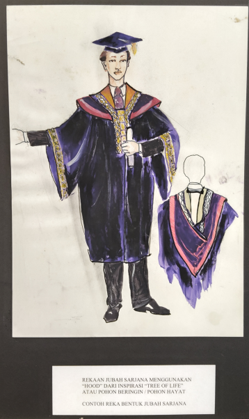 Rekaan jubah sarjana menggunakan “hood” dari inspirasi “tree of life” atau pohon beringin / pohon hayat |