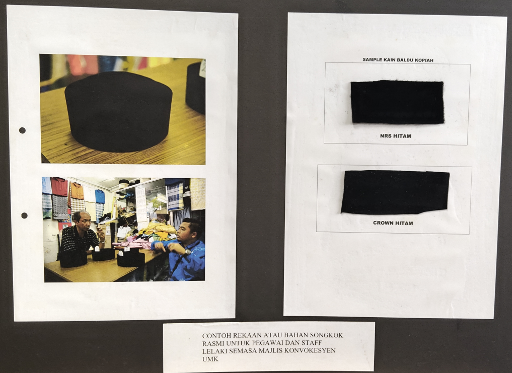 Contoh rekaan atau bahan songkok rasmi untuk pegawai dan staff lelaki semasa Majlis Konvokesyen UMK |