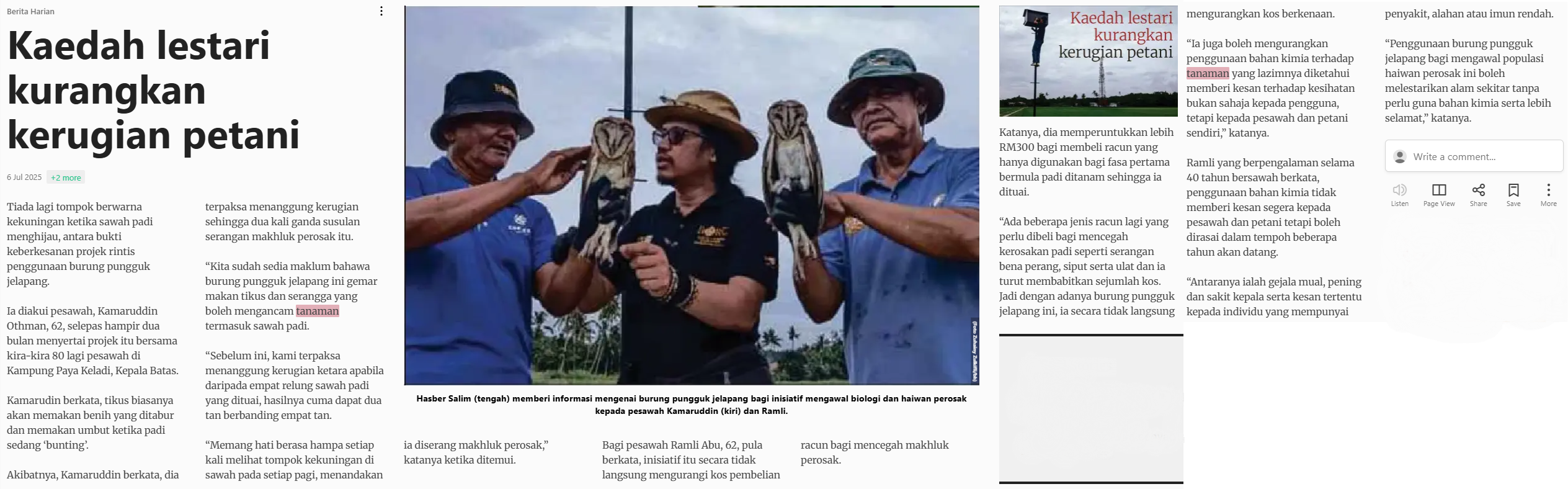 Berita Harian (2025) Kaedah lestari kurangkan kerugian petani. Berita Harian. |