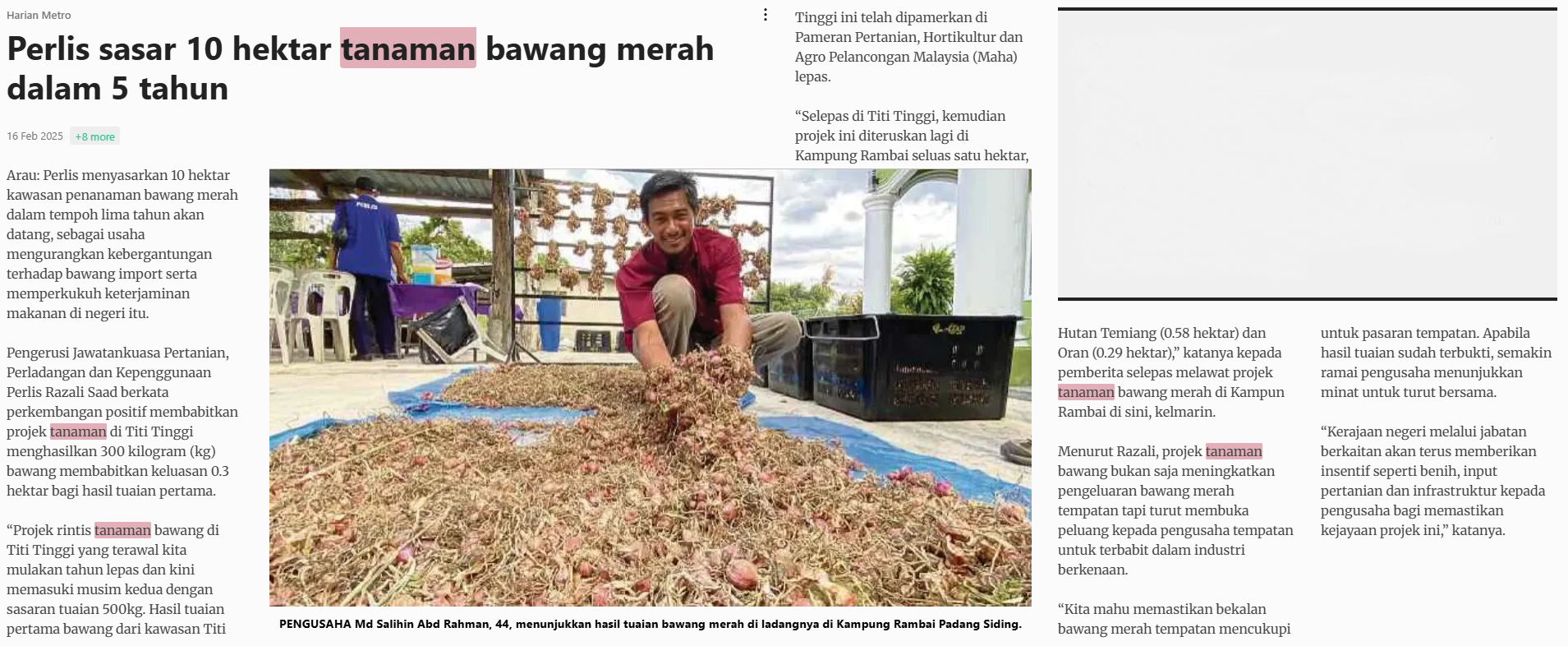 Harian Metro (2025) Perlis sasar 10 hektar tanaman bawang merah dalam 5 tahun. Harian Metro. |