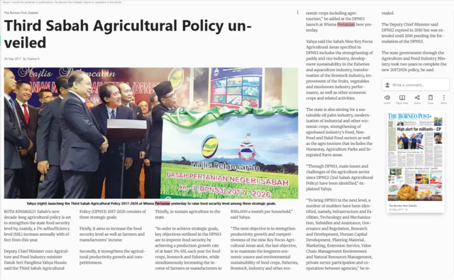Shalina R. (2017) Third sabah agricultural policy un-veiled. The Borneo Post (Sabah). |