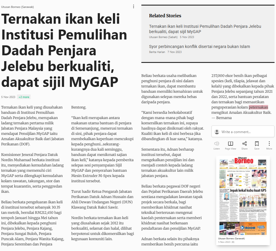 Bernama (2023) Ternakan ikan jeli Institusi pemulihan dadah penjara Jelebu berkualiti dapat sijil MyGAP. Utusan Borneo (Sarawak). |