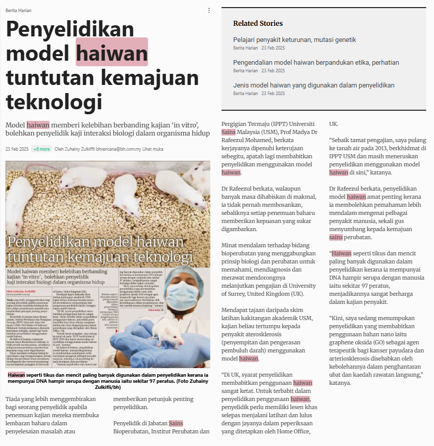 Zuhainy Zulkiffli (2025) Penyelidikan model haiwan tuntutan kemajuan teknologi. Berita Harian. |