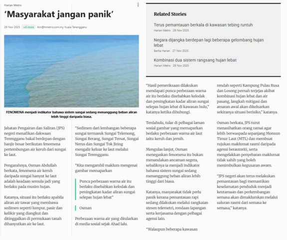 Bernama (2025) FenomenaMenjadi Indikator Bahawa Sistem Sungai Sedang Menanggung Beban Aliran Lebih Tinggi Daripada Biasa. Harian Metro. |
