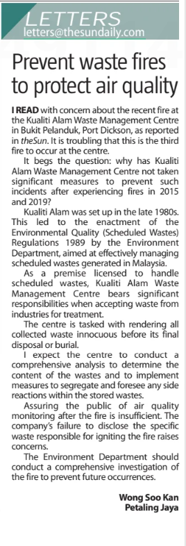 Wong Soo Kan (2024) Prevent waste fires to protect air quality. The Sun (Malaysia). |
