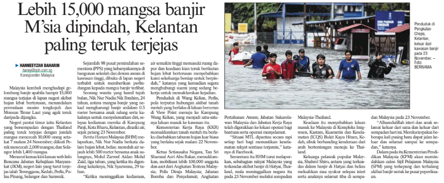 Hanneeyzah Baharin (2025) Lebih 15,000 Mangsa Banjir M’sia Dipindah, Kelantan Paling Teruk Terjejas. Berita Harian. |