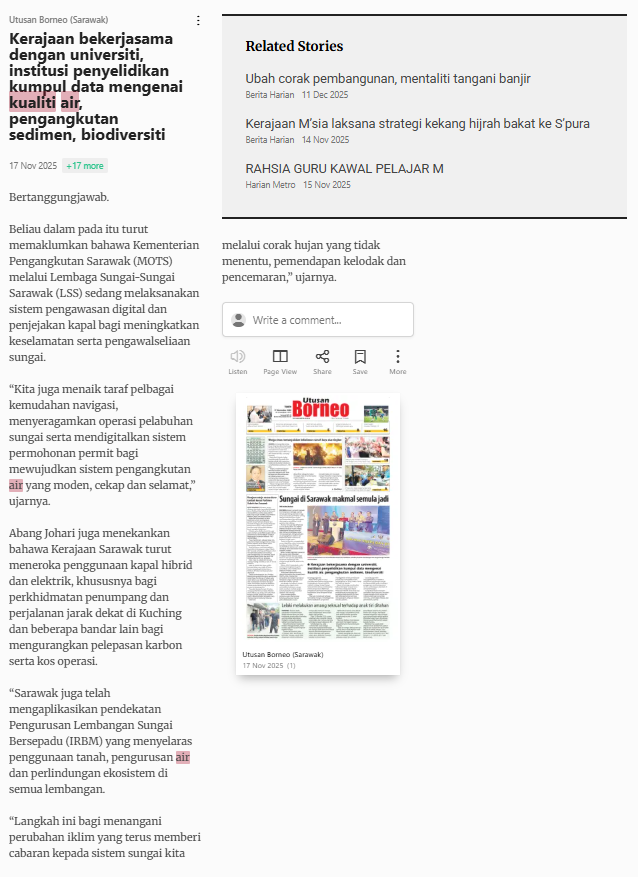 Bernama (2025) Kerajaan bekerjasama dengan universiti, institusi penyelidikan kumpul data mengenai kualiti air, pengangkutan sedimen, biodiversiti. Utusan Borneo (Sarawak). |