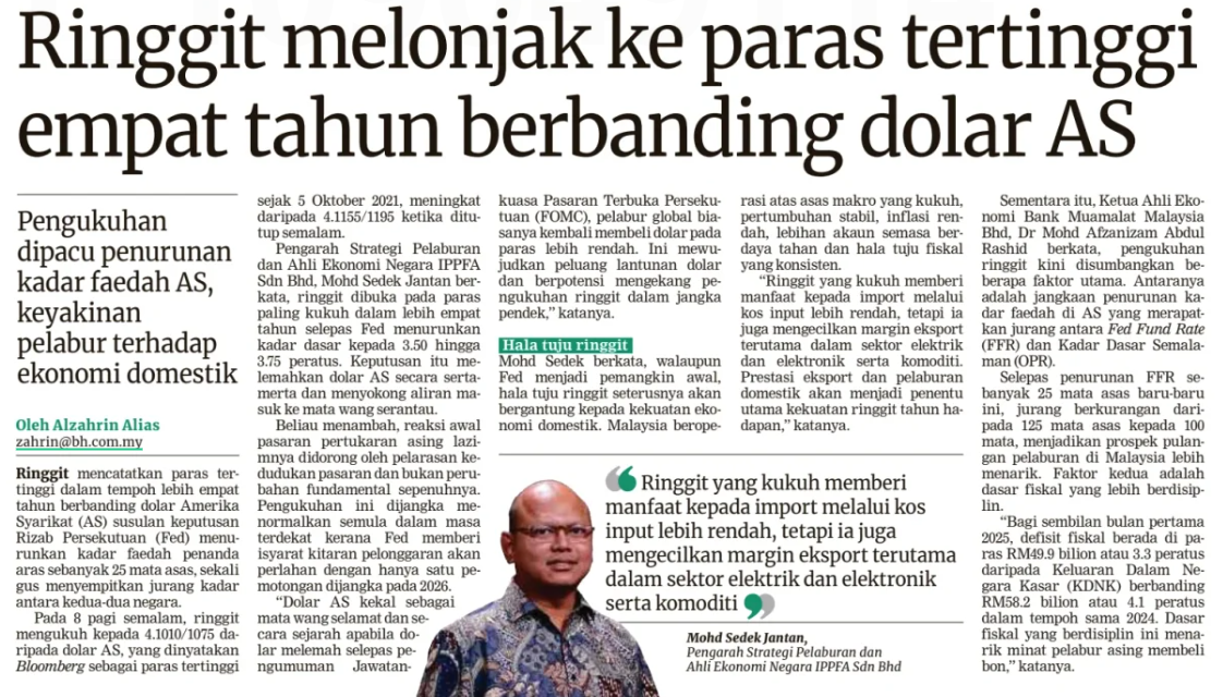 Alzahrin Alias (2025) Ringgit melonjak ke paras tertinggi empat tahun berbanding dolar AS. Berita Harian. |