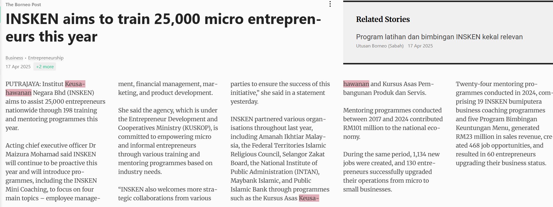 Bernama (2025) INSKEN aims to train 25,000 micro entrepreneurs this year. The Borneo Post. |