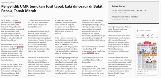 Bernama (2020) Penyelidik UMK temukan fosil tapak kaki dinosaur di Bukit Panau, Tanah Merah. Utusan Borneo (Sarawak). |