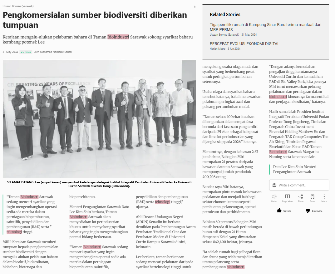 Mohamad Norhadie Sahari (2024) Pengkomersialan sumber biodiversiti diberikan tumpuan. Utusan Borneo (Sarawak). |