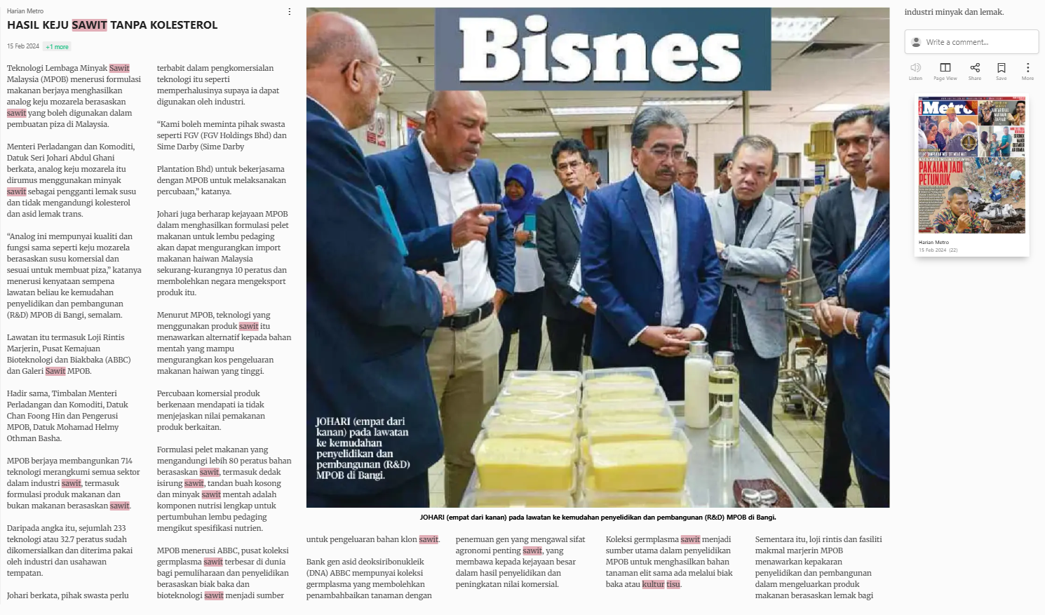 Bernama (2024) Hasil keju sawit tanpa kolestrol. Berita Harian. |
