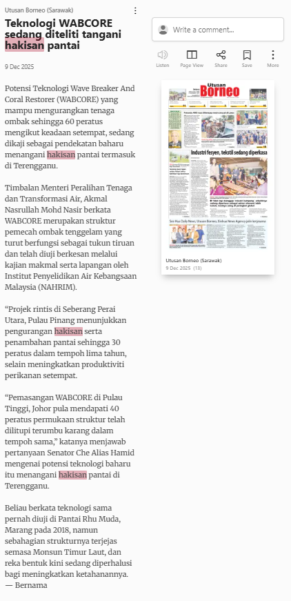 Bernama (2025) Teknologi WABCORE sedang diteliti tangani hakisan pantai. Utusan Borneo (Sarawak). |