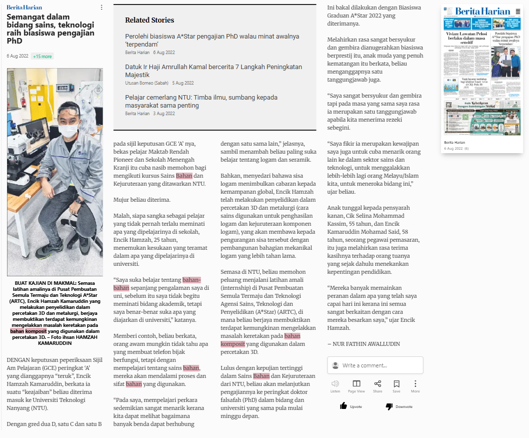Bernama (2022) Semangat dalam bidang sains, teknologi raih biasiswa pengajian PhD. Berita Harian. |