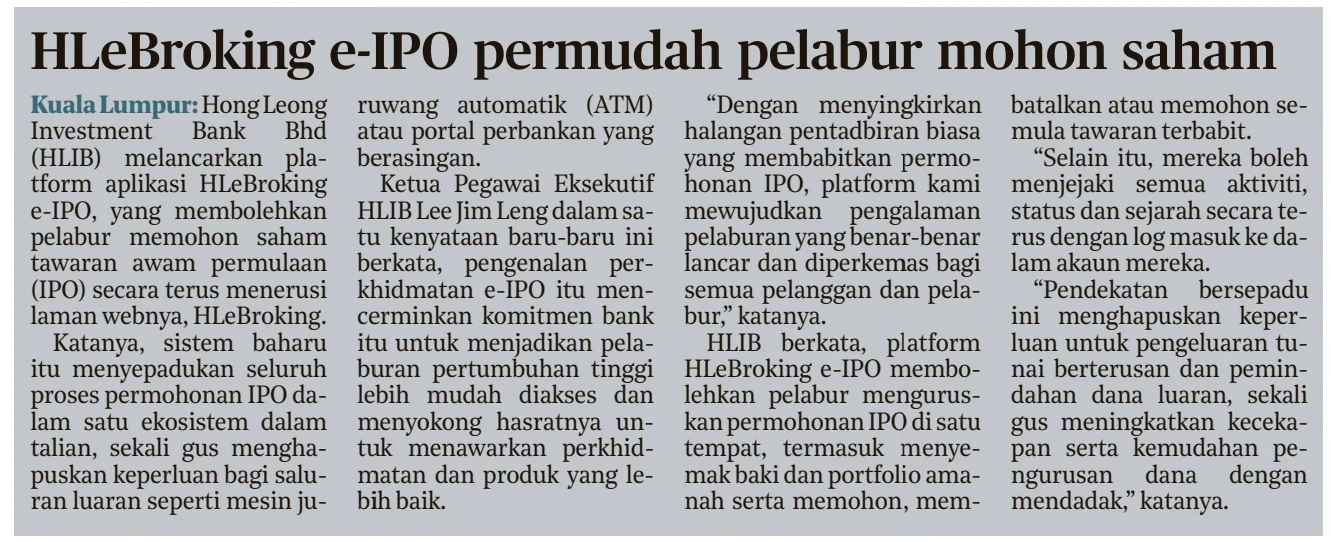 Sri Ayu Kartika Amri (2025) HLeBroking e-IPO permudah pelabur mohon saham. Harian Metro. |