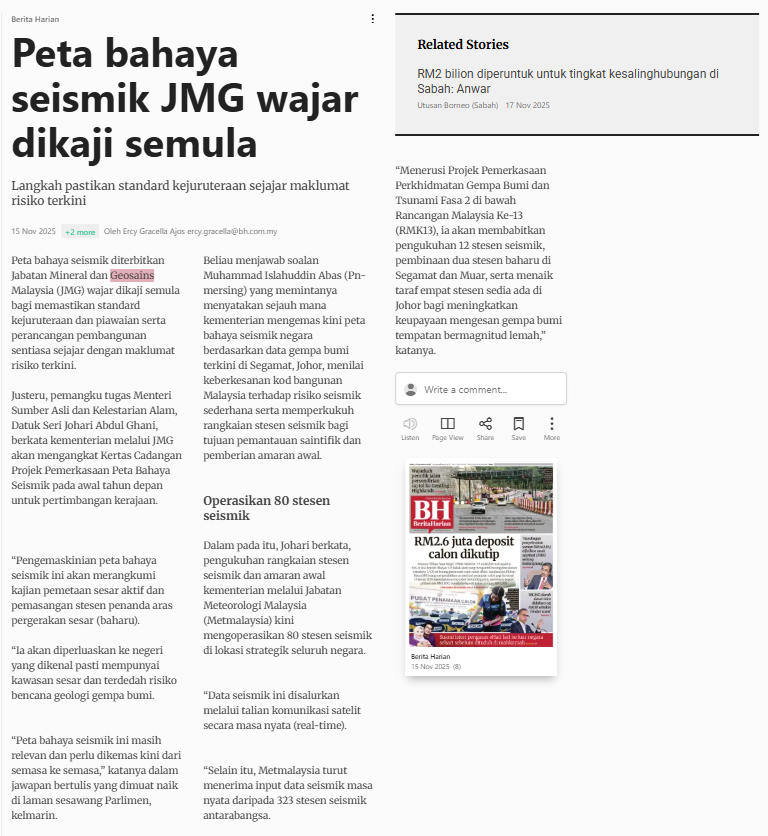 Ercy Gracella Ajos (2025) Peta bahaya seismik JMG wajar dikaji semula. Berita Harian. |