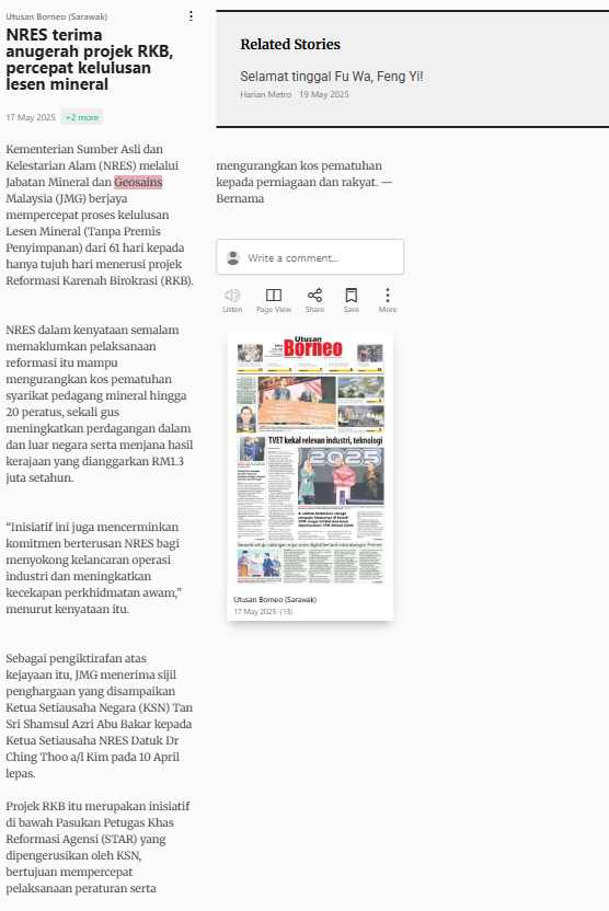 Bernama (2025) NRES terima anugerah projek RKB, percepat kelulusan lesen mineral. Utusan Borneo (Sarawak). |