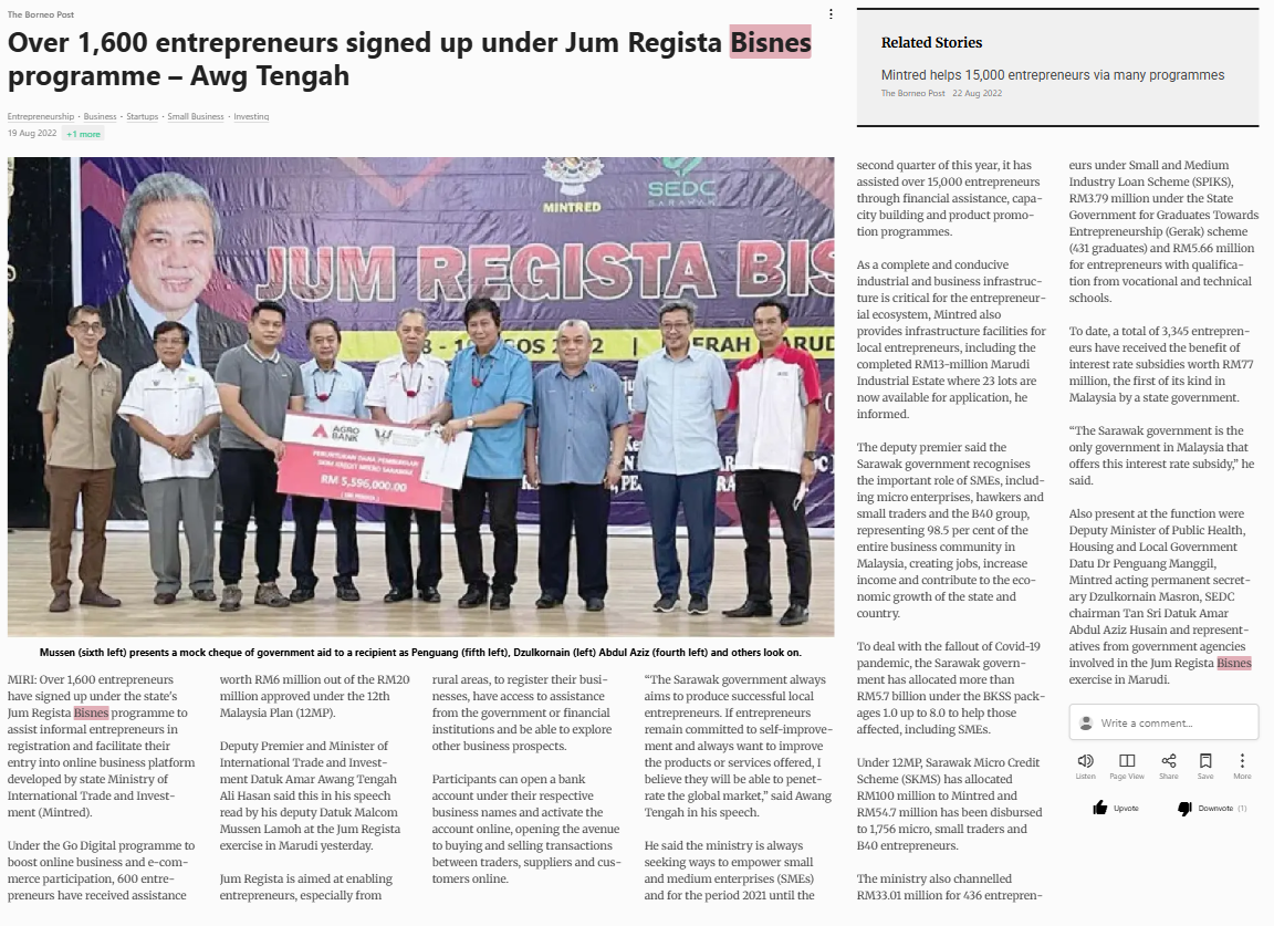 Bernama (2022) Over 1,600 entrepreneurs signed up under Jum Regista Bisnes programme. The Borneo Post. |