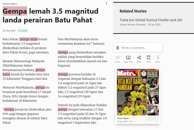 Bernama (2025) Gempa Lemah 3.5 Magnitud Landa Perairan Batu Pahat. Harian Metro. |