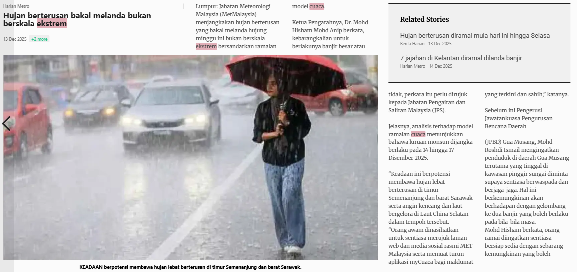 Bernama (2025) Hujan Berterusan Bakal Melanda Bukan Berskala Ekstrem. Harian Metro. |