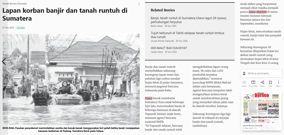 Bernama (2025) Lapan Korban Banjir Dan Tanah Runtuh Di Sumatera. Utusan Borneo (Sarawak). |