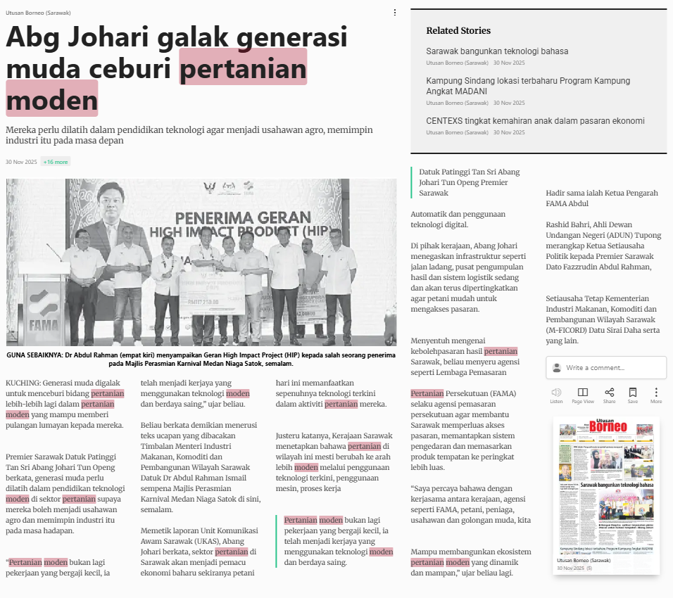Bernama (2025) Abg Johari galak generasi muda ceburi pertanian moden. Utusan Borneo (Sarawak). |