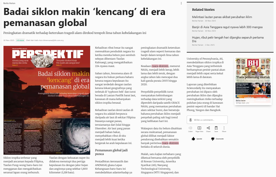 Ilah Hafiz Aziz (2025) Badai Siklon Makin ‘Kencang’ Di Era Pemanasan Global. Berita Harian. |